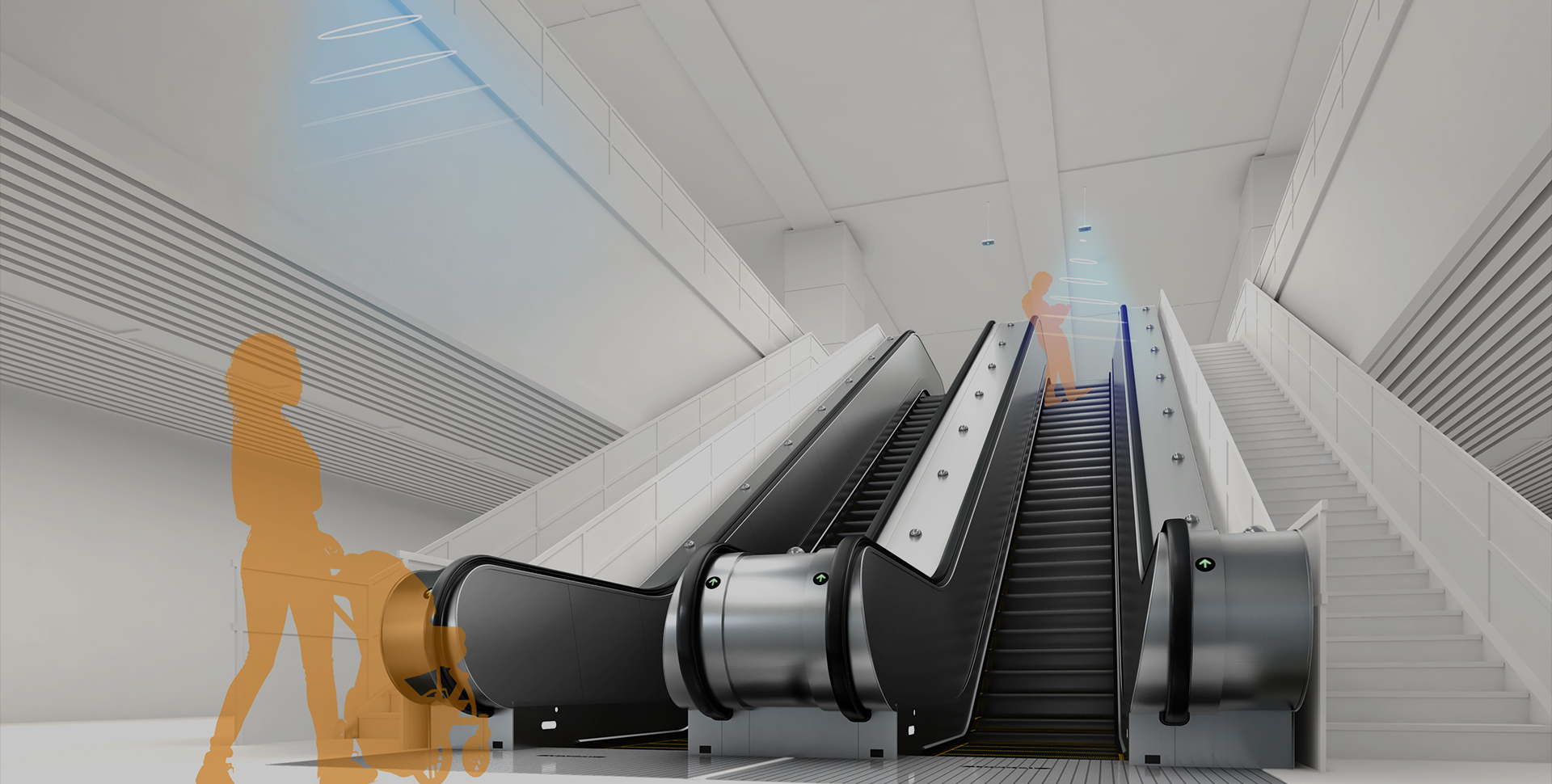 梯級滾輪采用全聚氨酯包裹堅固軸承的一體化設計,配合高強度梯級鏈,扶梯運行流暢靜音。